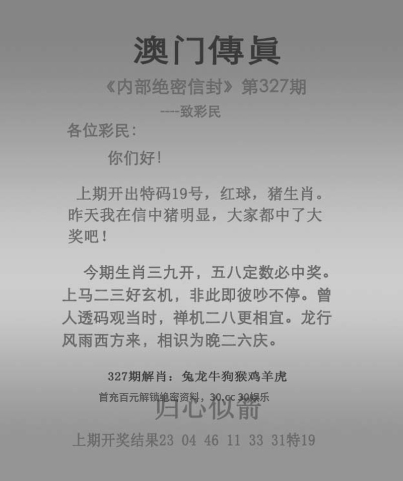 | 327期 今期生肖三九开,五八定数必中奖 上马二三好玄机,非此即彼吵不停 曾人透码观当时,禅机二八更相宜 龙行风雨西方来,相识为晚二六庆 |